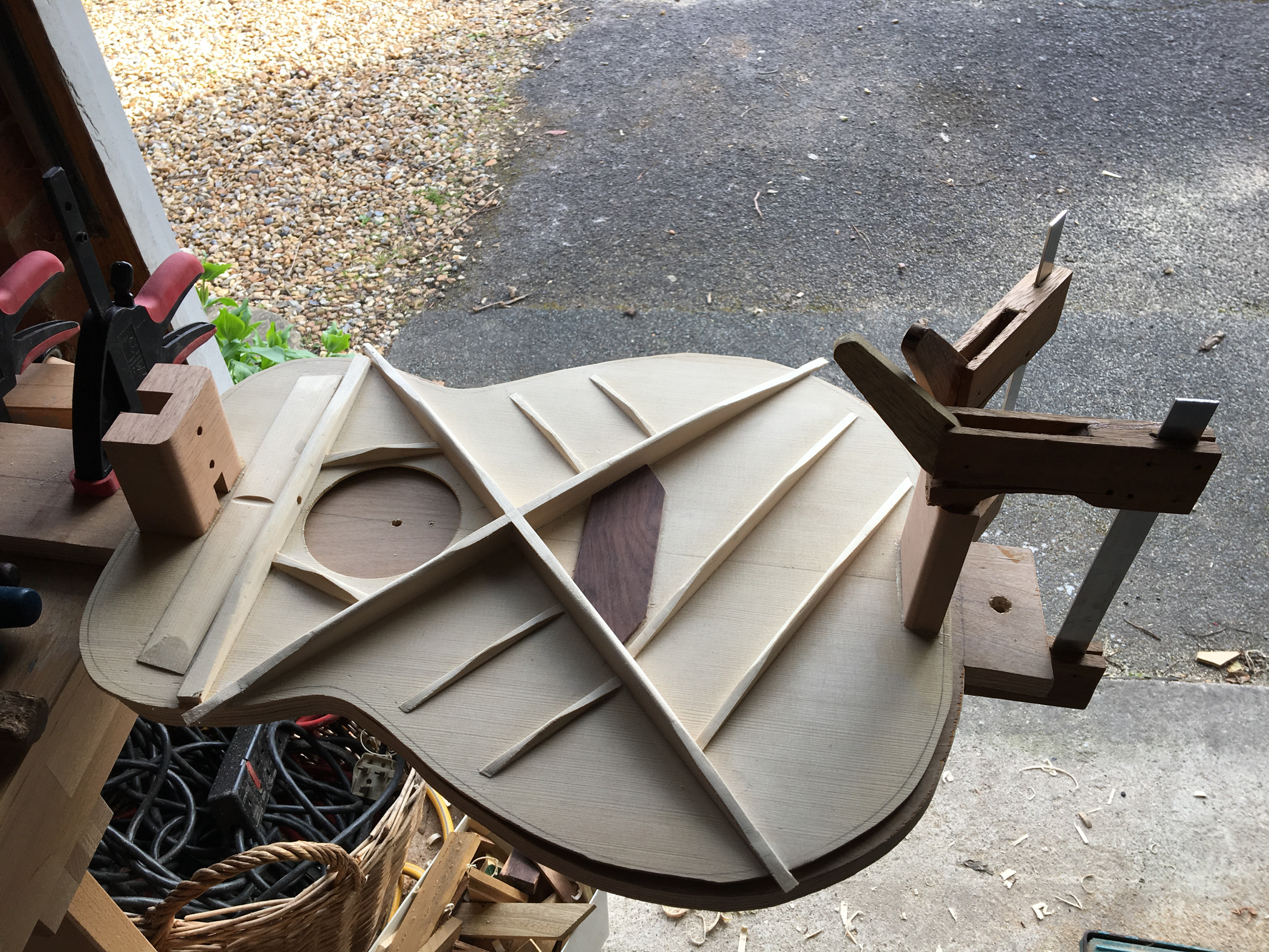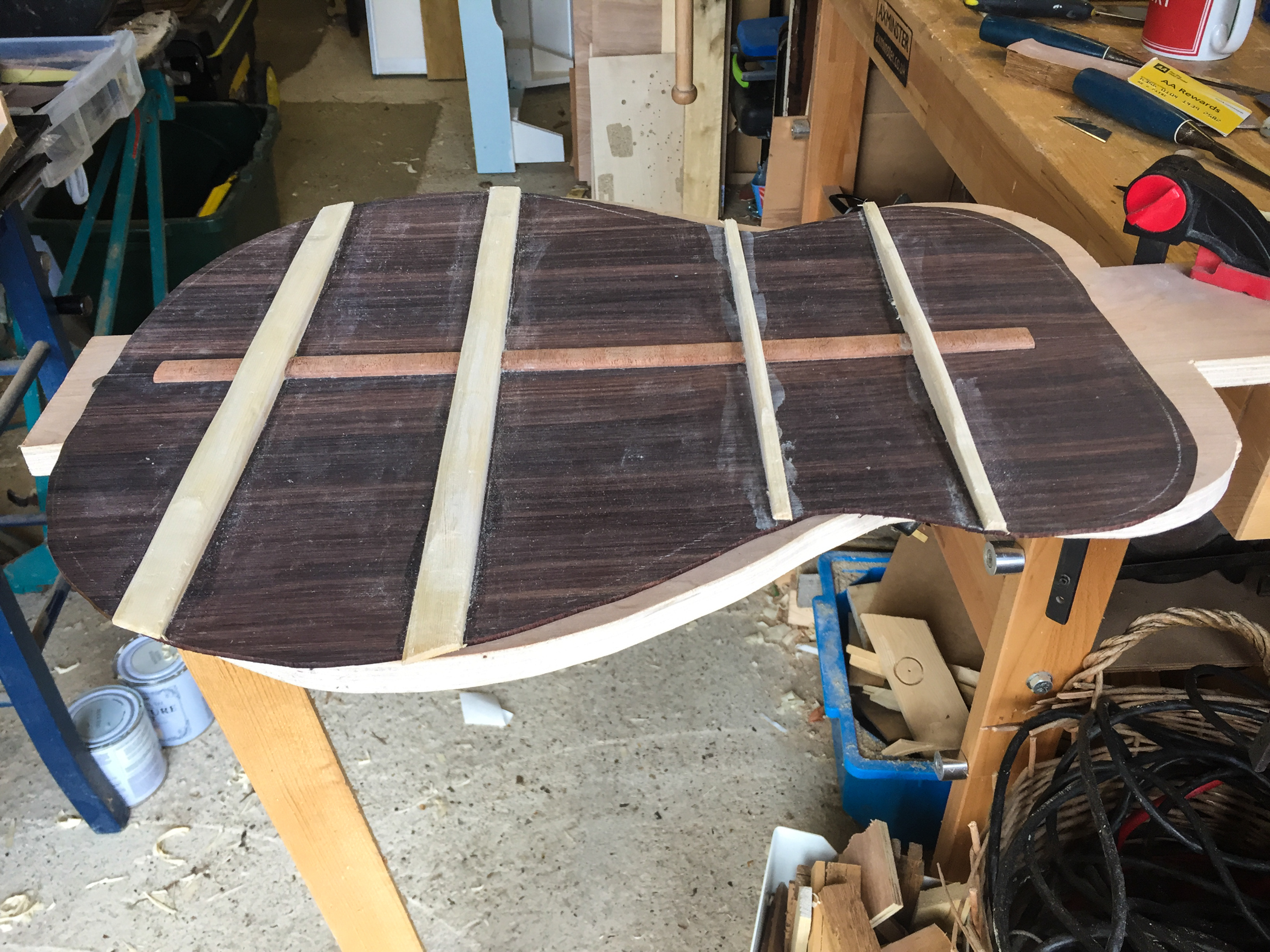 Owning up: at this stage I stopped the build and left the braced front and back in the garage during the winter. The front survived but the cold and the damp caused the back to bow the wrong way - concave rather than convex. I had to carve off the braces, make a new set and glue those in place. Thankfully this has worked fine.