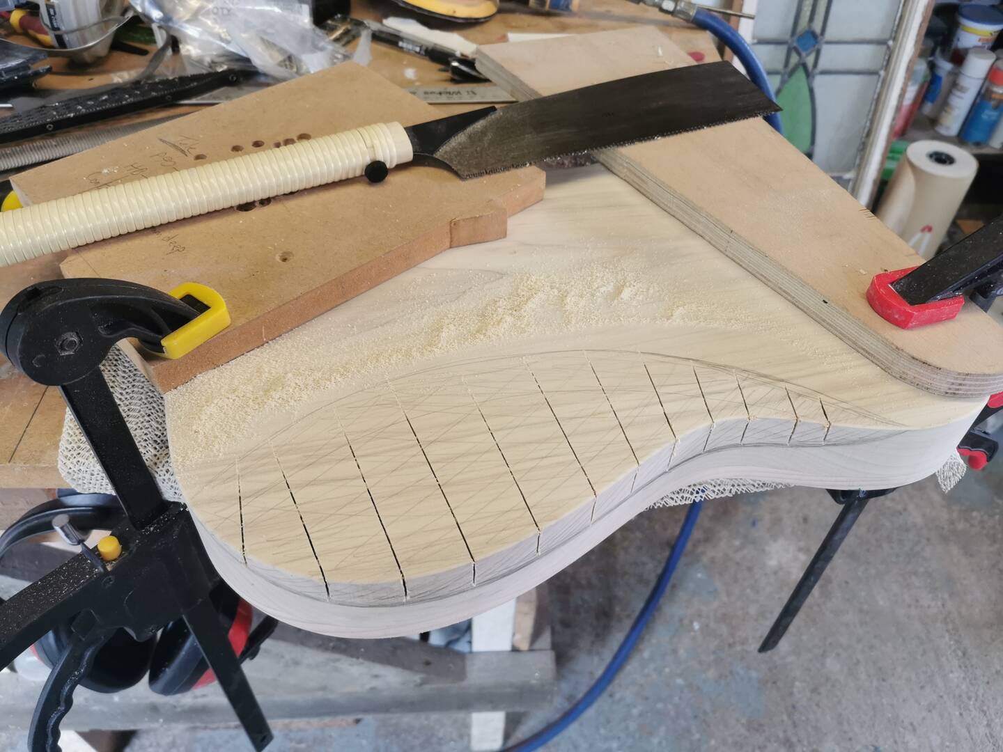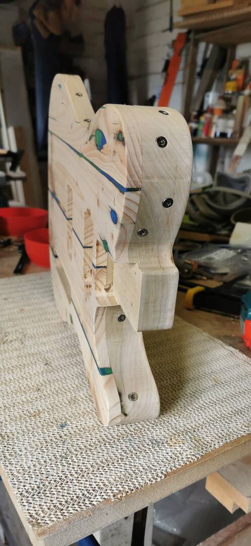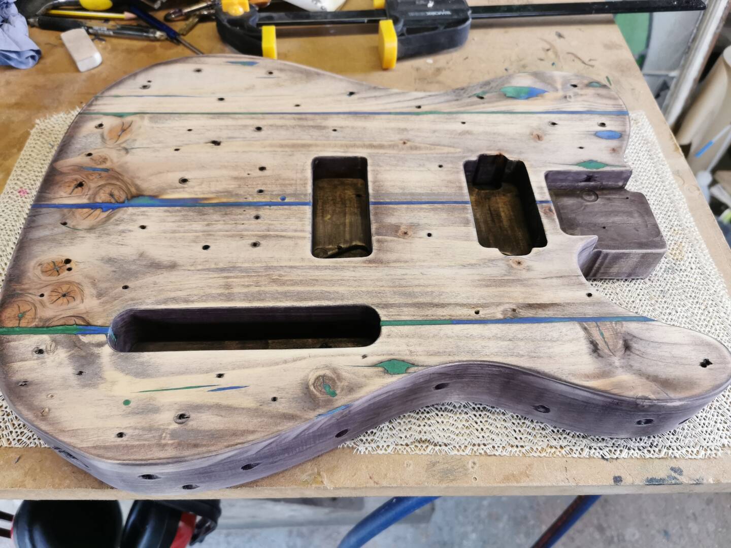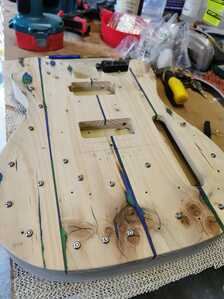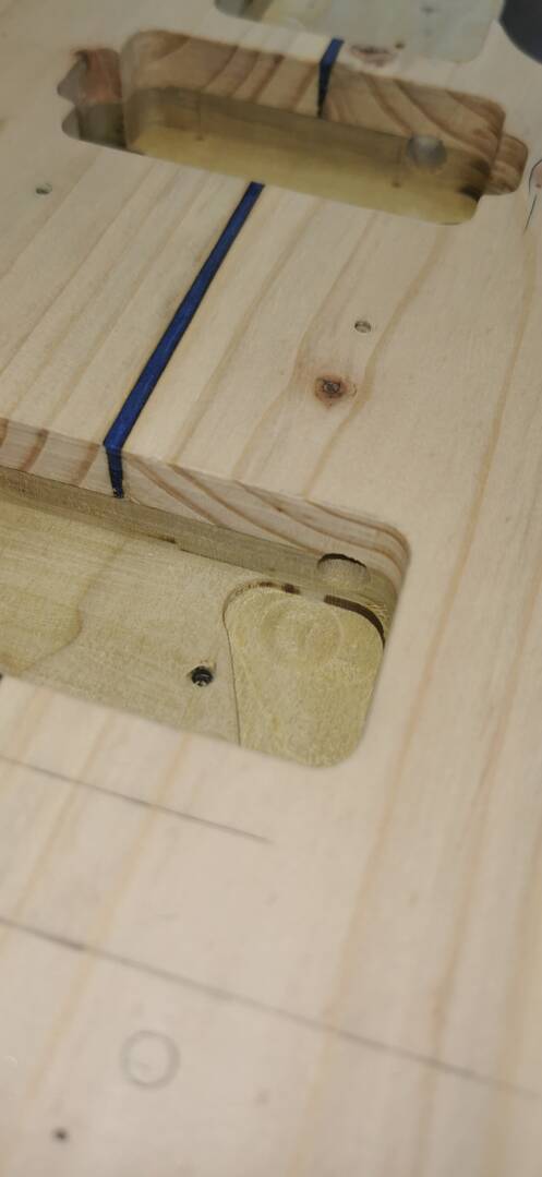 I forgot to take pictures of applying templates and routing cavities etc but that is all done as normal. This guitar is having a P90 pickup in the bridge and a humbucker in the neck, oh and a short Wilkinson Tele bridge with compensated saddles.