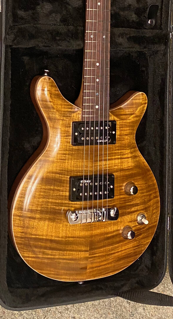 The design considerations when chambering, carve top styling, the joy/pain of carving a fancy maple top, double staining, faux binding. My very first attempt an a nitro finish. With all the sanding and buffing I should have forearms like Popeye (probably showing my age with that reference.). In fact I thought I had sanded the life out of this project and in the final analysis I could have and should have gone further. Everything shows up - even when it could barely seen. So, it’s not perfect but only I can see where the bodies are buried! I also achieved my best ever fret job! Plays like a dream.