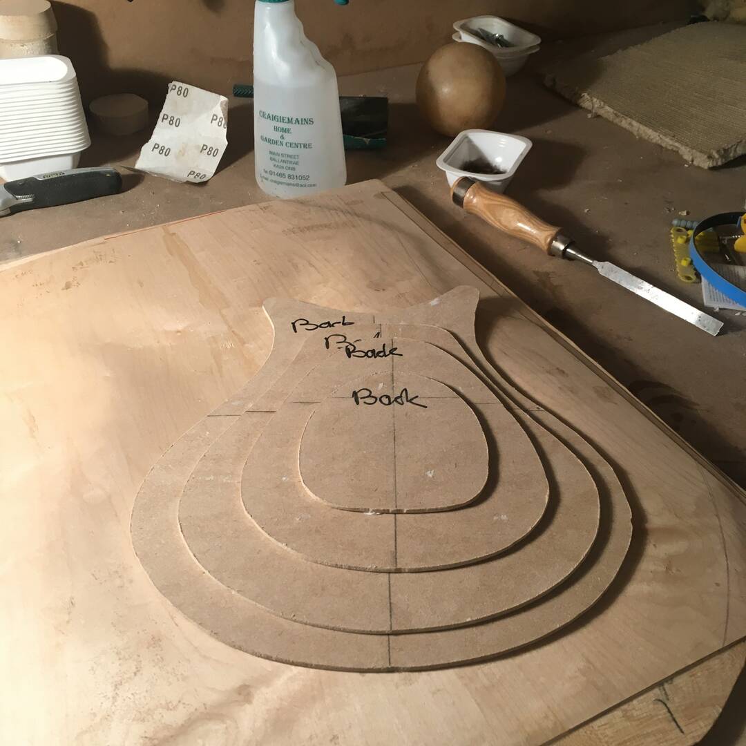 By now, I had made two new moulds for back and front with 4 layers of 3mm MDF: i.e. an arch of around 12mm rather than 15mm as previously. And with gentler curves.