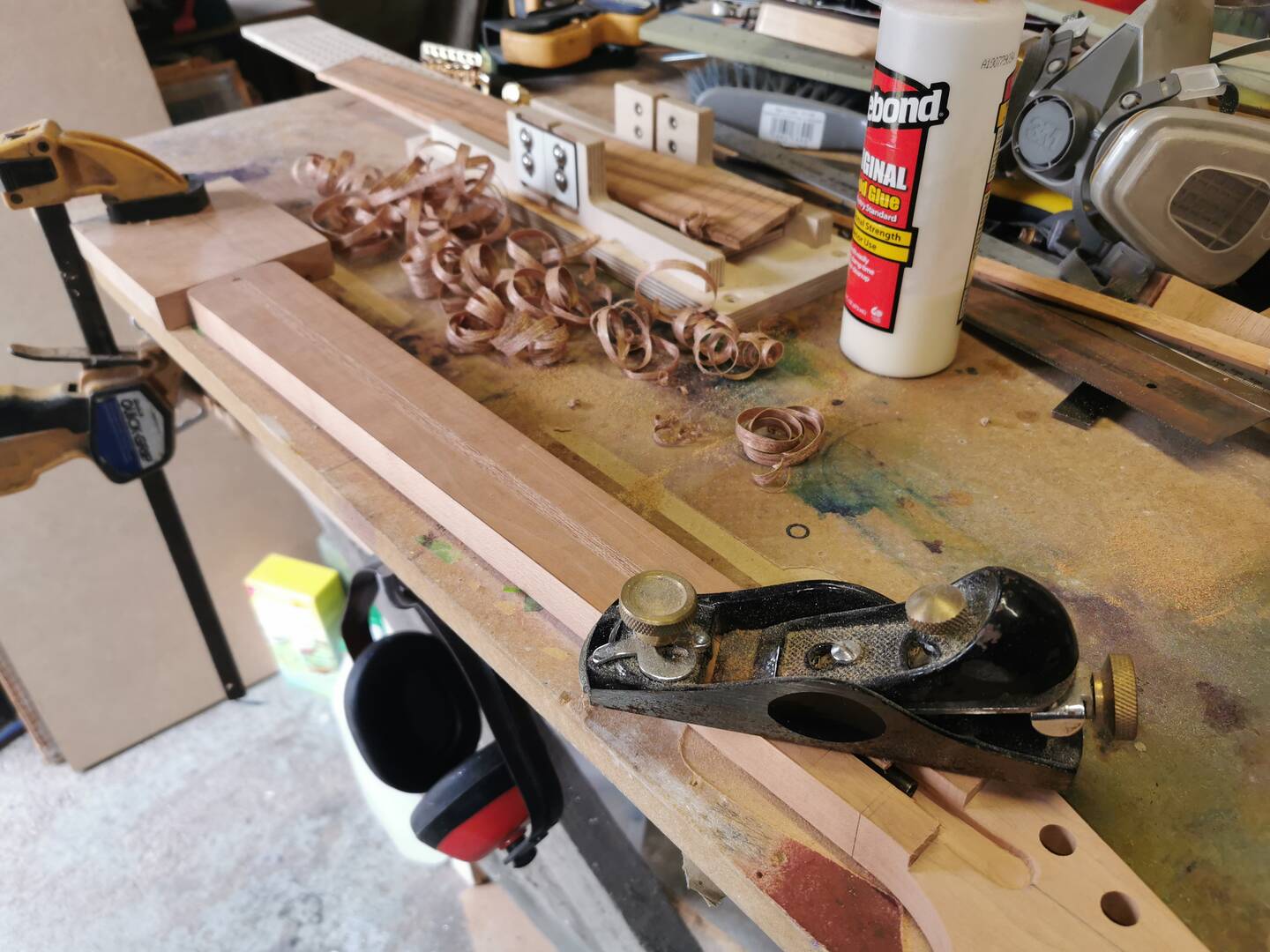 Time to get the fretboard on. I always lightly clamp it in place first and make sure everything lines up and is in the right place.