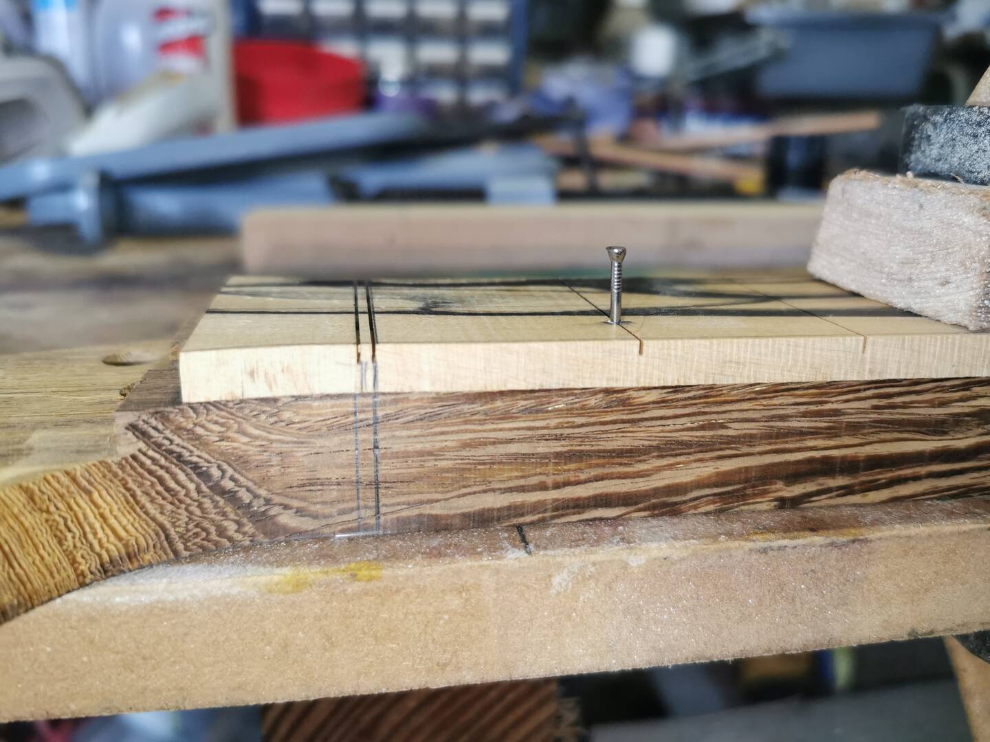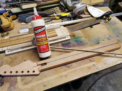 I am, of course, using the “Bagpress Fret Slotting Jig” from @darrenking to slot my fretboard blank (I still don’t know what wood this is). This jig really is super simple and easy to use, consistent, reliable and inexpensive in cost. It’s worth every penny to the serious guitar builder, whether professional or amateur. Go buy one. 👍