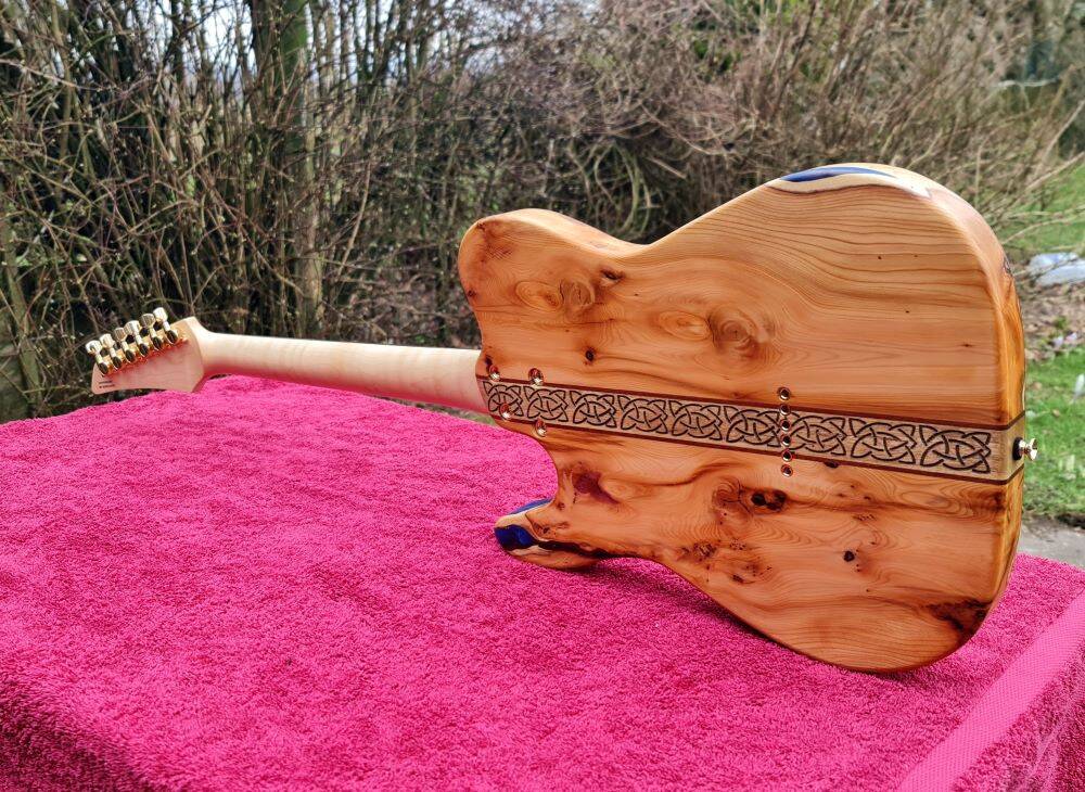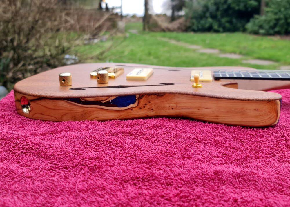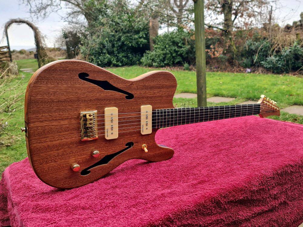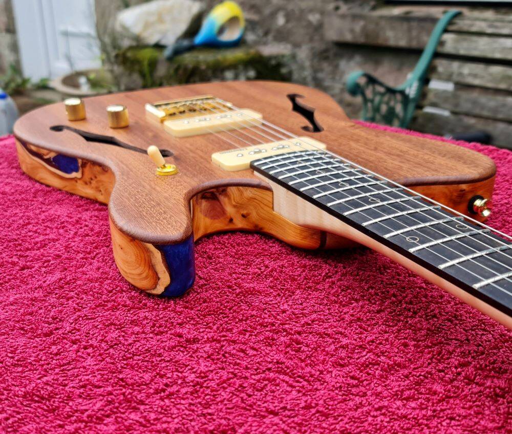 Latest build is a double f hole thinline tele, body is yew and resin with a sipo mahogany top, slightly flamed maple neck with ebony board. Loving the P90's from warman guitars