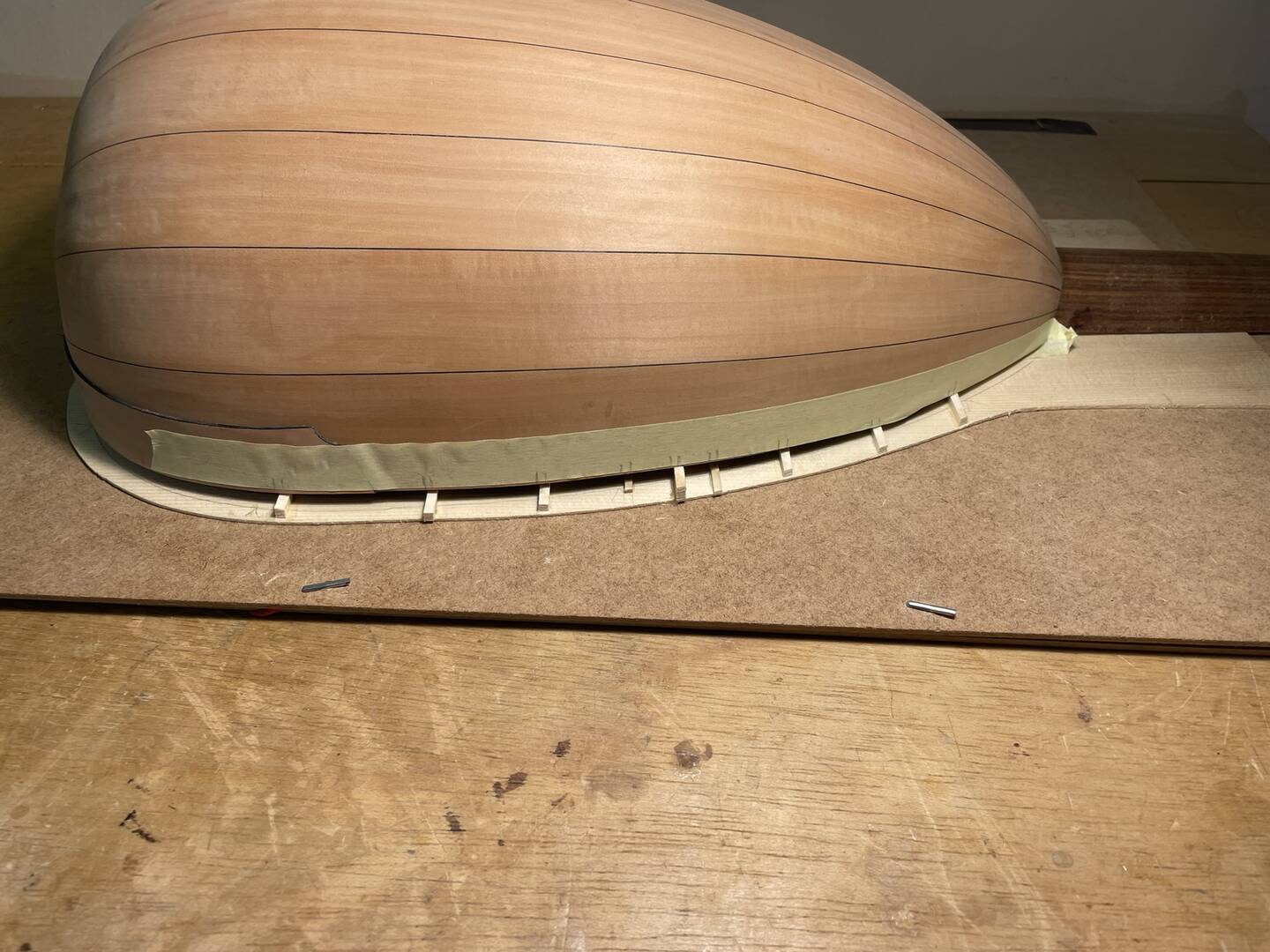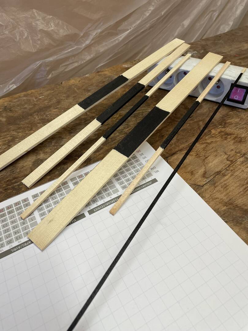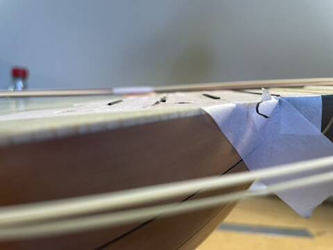 For the ribs, I cut the first rib from 1.4 mm thick strips of pearwood.( planed down from approx 3 mm ) and place it on the mold.