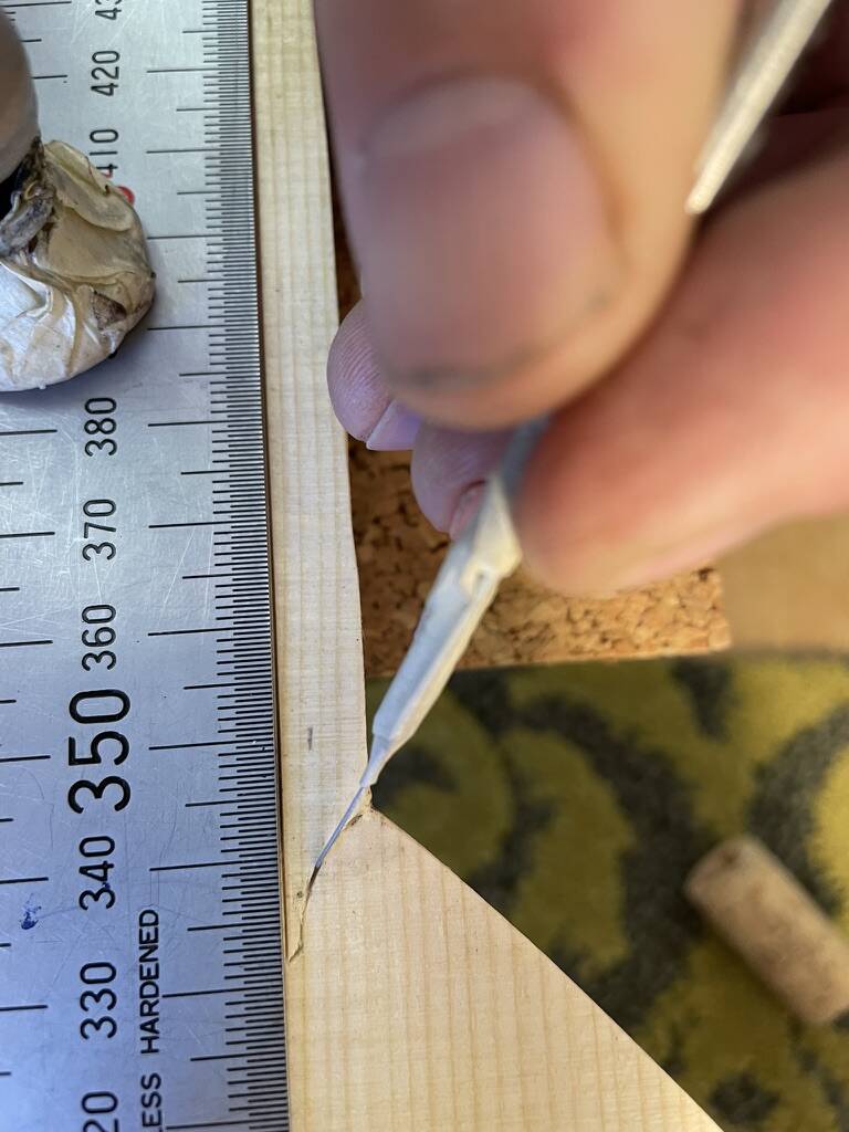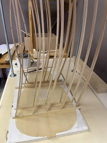 Next , I form the strips of veneer that will act as a spacer between each rib and also bend these into shape using heat ( with a mini iron )
