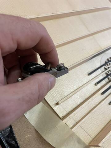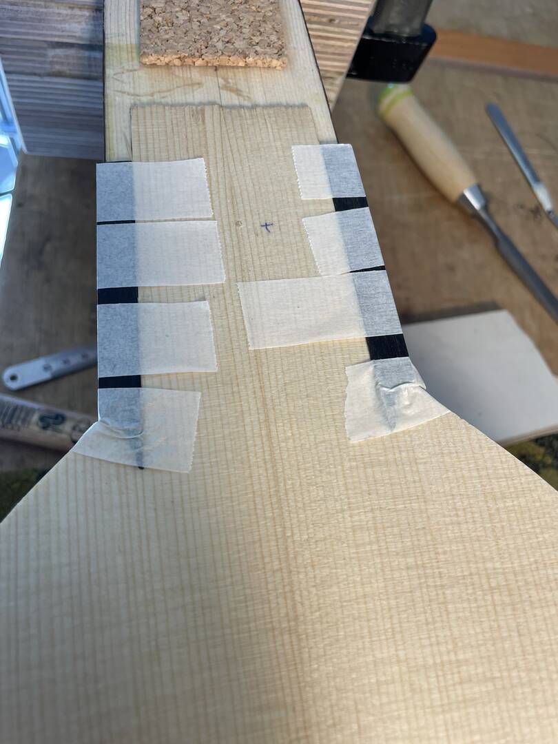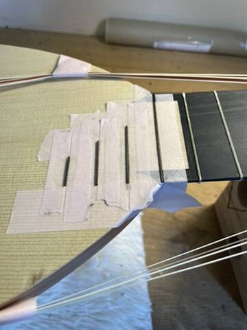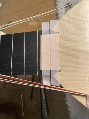 After marking out the location of these frets, I mark the outside lines of the fret with 2 pieces of masking tape, which will prevent the fret from sliding during glue up and also keep the glue from making a mess on the soundboard.