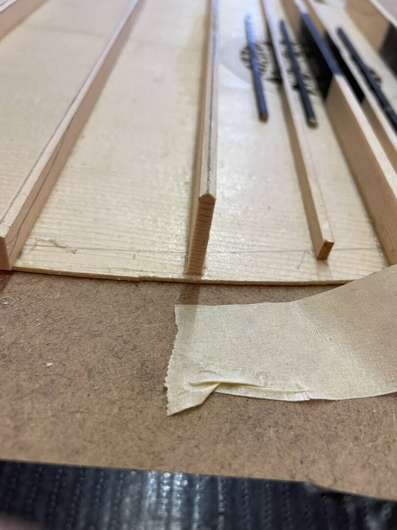 The standard masking tape has a good elasticity I can use to my advantage. After applying glue, I tape both ribs together, but I stretch the tape and then stick it to both ribs. Once the tape sticks to both ribs, I release and the tape relaxes back, and by doing so, pulls both ribs even tighter.