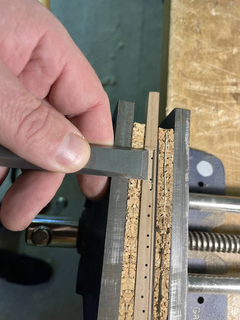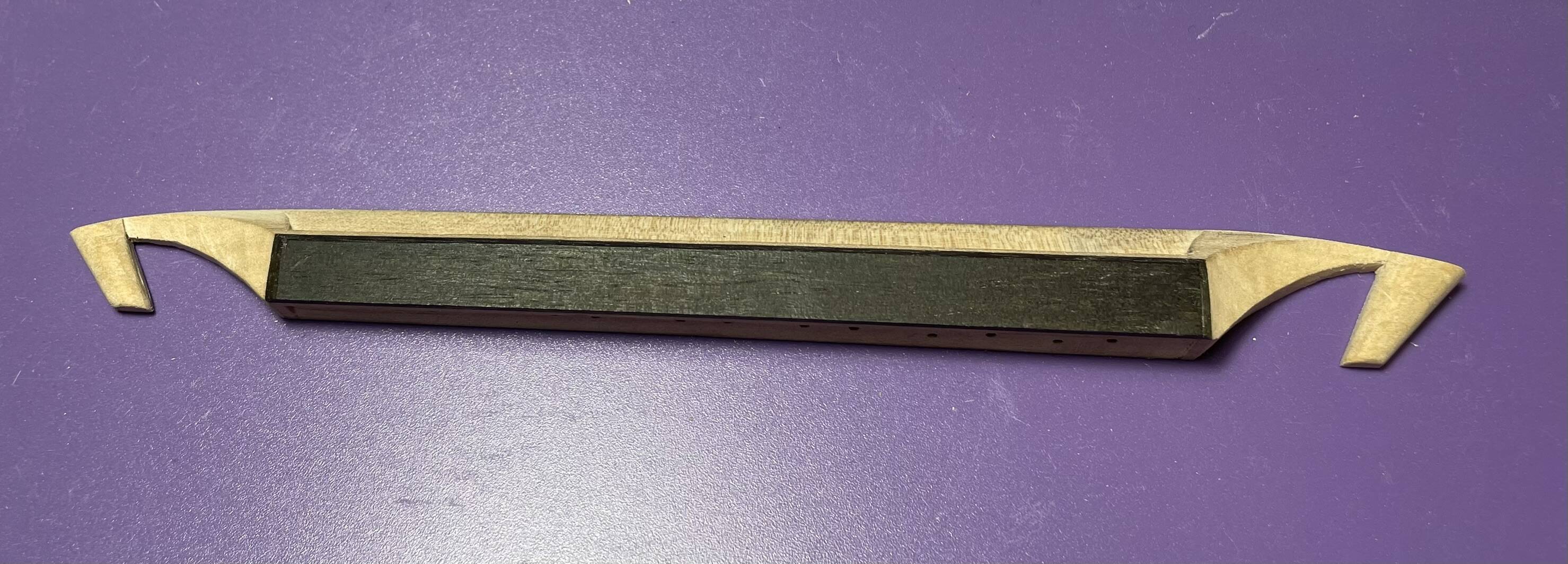 I then add a reinforcement strip on top ( ebony ) to protect the top of the pear bridge.