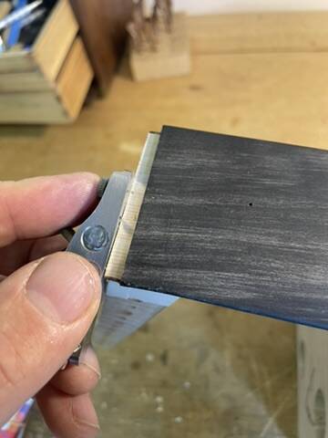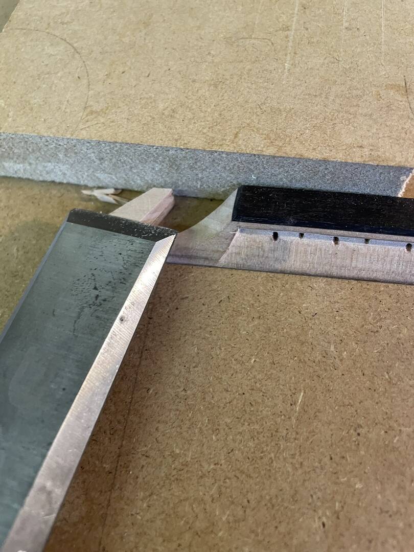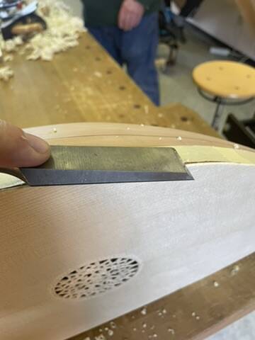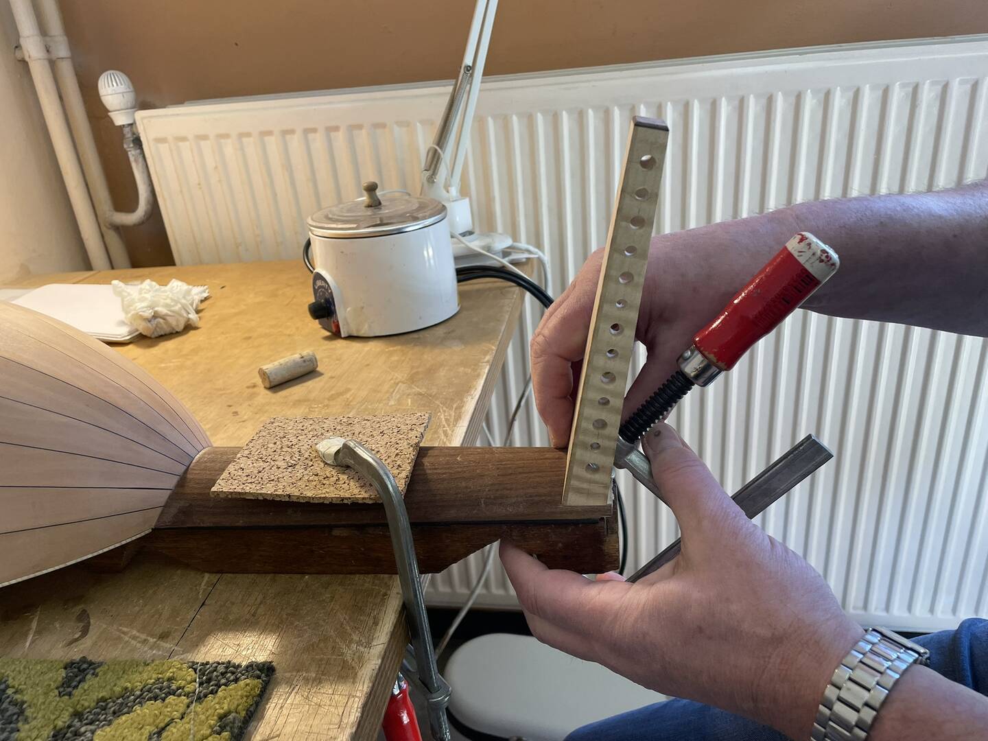 I now check if the neck and heelblock have a good and tight connection. I test this with a very fine feeler gauge and remove material from the neck end with a scraper, until I cannot slide the feeler gauge between the neck and the heelblock.