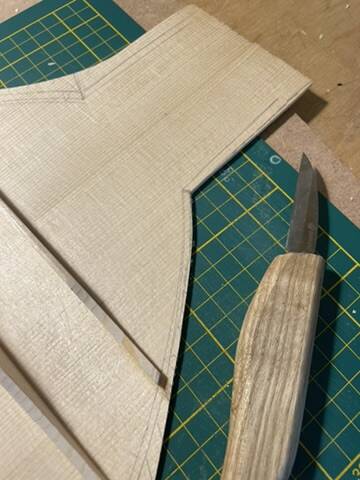 The shape is drawn on paper , over the shell and then transposed to a leftover piece form the ribs.