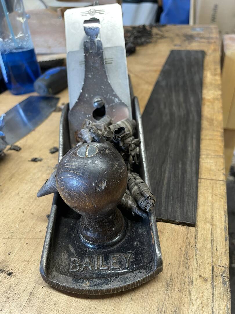 But since we don't have any blocking parts, we use a plane ( I used a No5 Jack plane ) to create the facets. And as stated before, I also keep following the contour on the underlying jig.