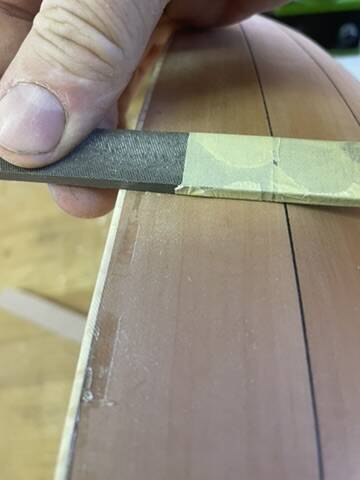 I only use a blockplane to shave off the high spots until the whole rib fits perfectly to the previous one, without trying to force them to meet up.
