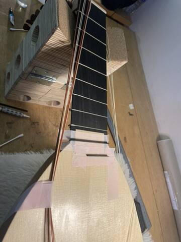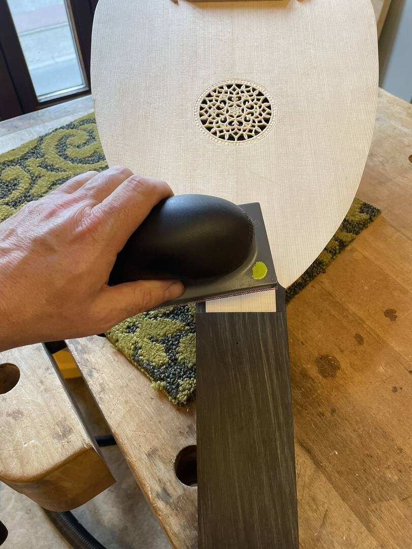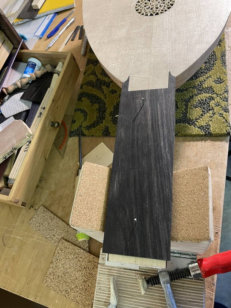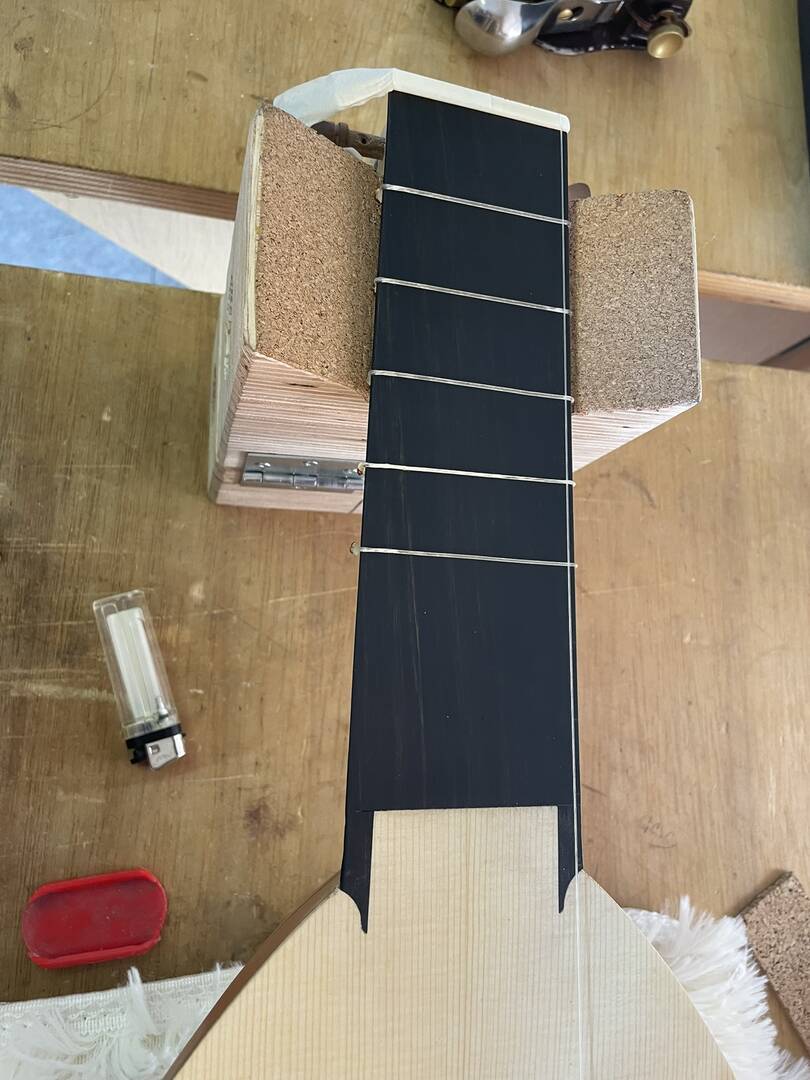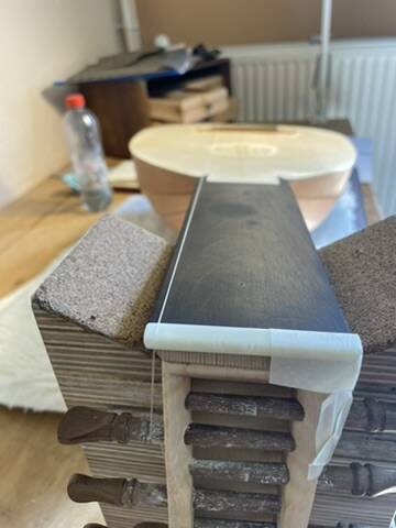 This involves a lot of carefully sanding,, only From the soundboard towards the headstock, to avoid ebony dust to set into the light spruce of the soundboard.