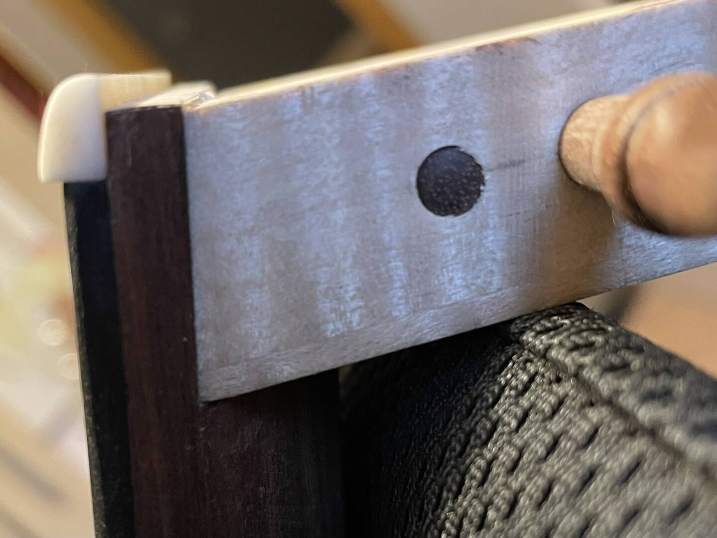 To prevent tear out in the inner side of the pegbox, I fill it with the MDF spacerblock I used to make the pegbox.
